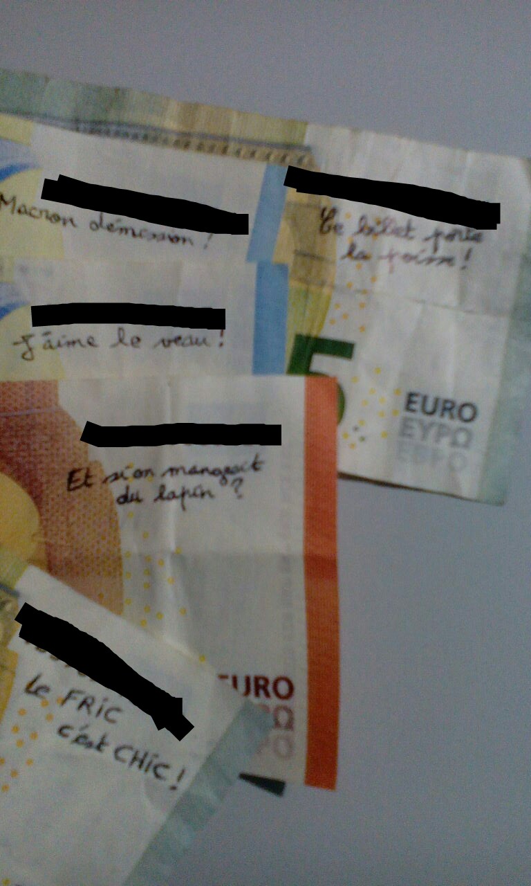de la BNP sont massacrés par ces marqueurs, que ce soit des billets usagés ou neufs, et a presque chaque échange je trouve des billets avec des grosses traces de feutres ...